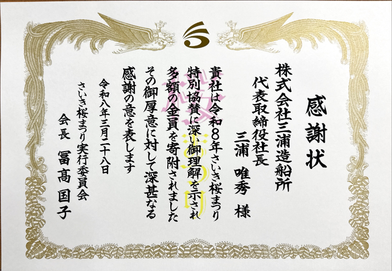 2026.03.28ニュースリリース 3/28(土) さいき桜まつり実行委員会より感謝状を頂きました。 2026年3月28日 土曜日 令和8年度さいき桜まつりの開催における特別協賛に対し、さいき桜まつり実行委員会より感謝状を頂きました。 Post ニュースリリース 天職大分に掲載されました。 関連記事一覧 3/13(水) 199総トン型旅客船兼自動車航送船が竣工致し... 8/26(土) 1561番船の進水式が行われました。 9/12(金) 1515番船の進水式が行われました。 2/22(火) 1371番船の進水式が行われました。 4/25(木) 749総トン型セメント専用船が竣工致しました。 10/5(月) 1533番船の進水式が行われました。