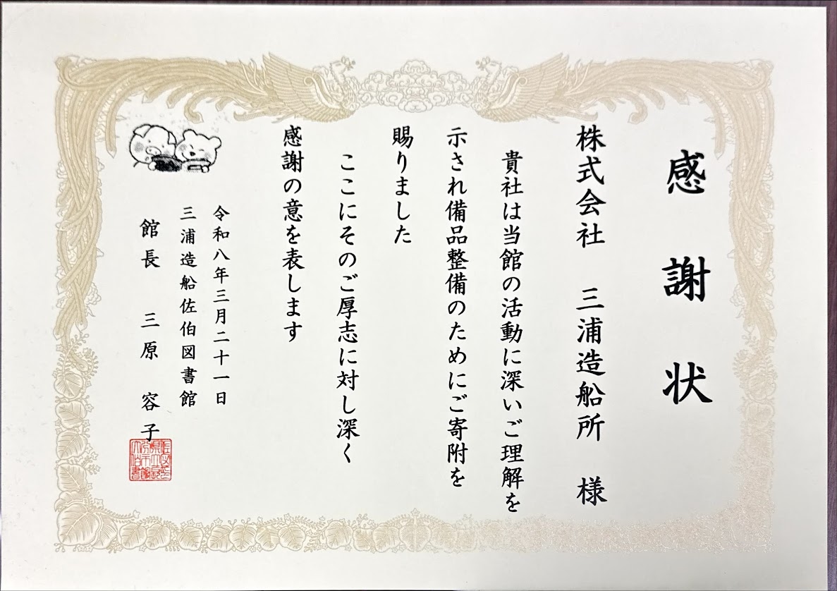 佐伯図書館 令和8年3月21日 佐伯市図書館のリニューアルにあたり寄附をしたことにより、佐伯図書館より感謝状を贈られる |